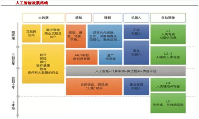 我们认为,从目前人工智能的应用场景来看,当前人工智能仍是以特定应用领域为主的弱人工智能,如图像识别、语音识别等生物识别分析,如智能搜索、智能推荐、智能排序等智能算法等。而涉及到垂直行业,人工智能多以辅助的角色来辅佐人类进行工作,诸如目前的智能投顾、自动驾驶汽车等,而真正意义上的完全摆脱人类且能达到甚至超过人类的人工智能尚不能实现。我们预计,未来随着运算能力、数据量的大幅增长以及算法的提升,弱人工智能将逐步向强人工智能转化,机器智能将从感知、记忆和存储向认知、自主学习、决策与执行进阶。