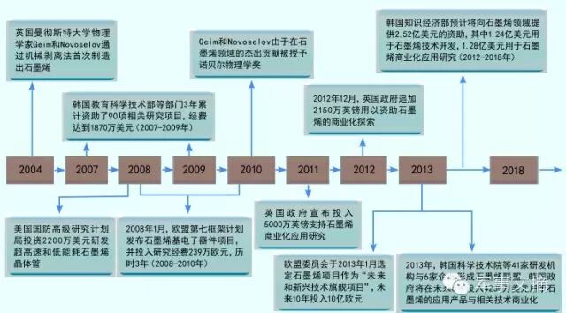 日韩等国加大投入力度。日本学术振兴机构从2007年起开始对石墨烯材料、器件的技术进行资助,并以实现绿色低碳为目标重点,支持碳纳米管和石墨烯的批量合成技术研发。韩国预计2012~2018年间向石墨烯领域提供总额为2.5亿美元的资助。