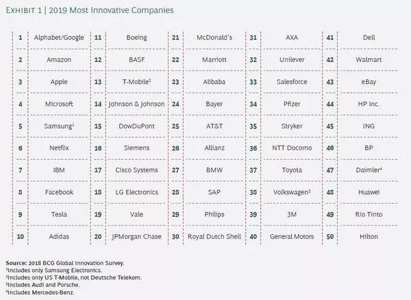 波士顿咨询集团 (Boston Consulting Group) 在 2019 年发布了第 13 份年度报告,对全球最具创新力的公司进行了评选。