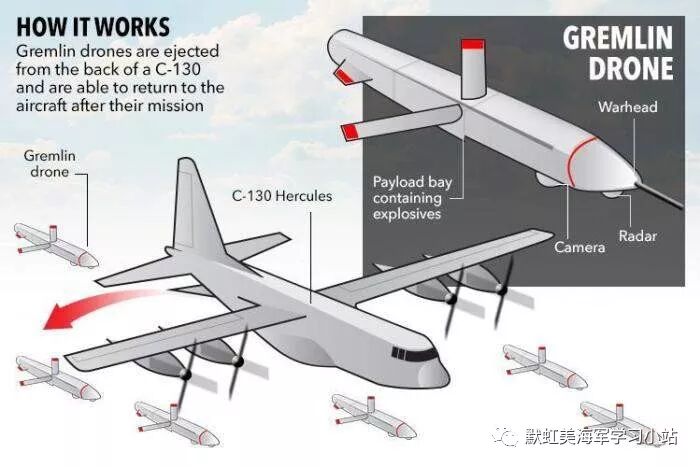 Gremlins无人机本身长约14英尺,满油后重约1600磅。Wierzbanowski说,这比目前的巡航导弹大得多,比Perdix微型无人机也大得多。