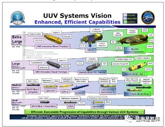如下图所示,美海军将无人水面艇根据尺寸分为四个类别:大型、中型、小型和超小型。无人潜航器则分为超大型、大型、中型和小型四个类别。小型无人系统通常由有人舰船或潜艇搭载和释放,以扩展有人系统的任务能力;而像大型和中型无人水面艇、超大型无人潜航器这类无人系统则倾向于直接从基地码头出发,替代有人系统执行任务。美海军目前尚未确定是否将这些可替代有人舰艇执行任务的大型无人系统计入海军舰艇数量中。无人水面艇和无人潜航器的部署有助于美海军向分布式舰队兵力结构转变,减少大型有人战舰的数量需求。