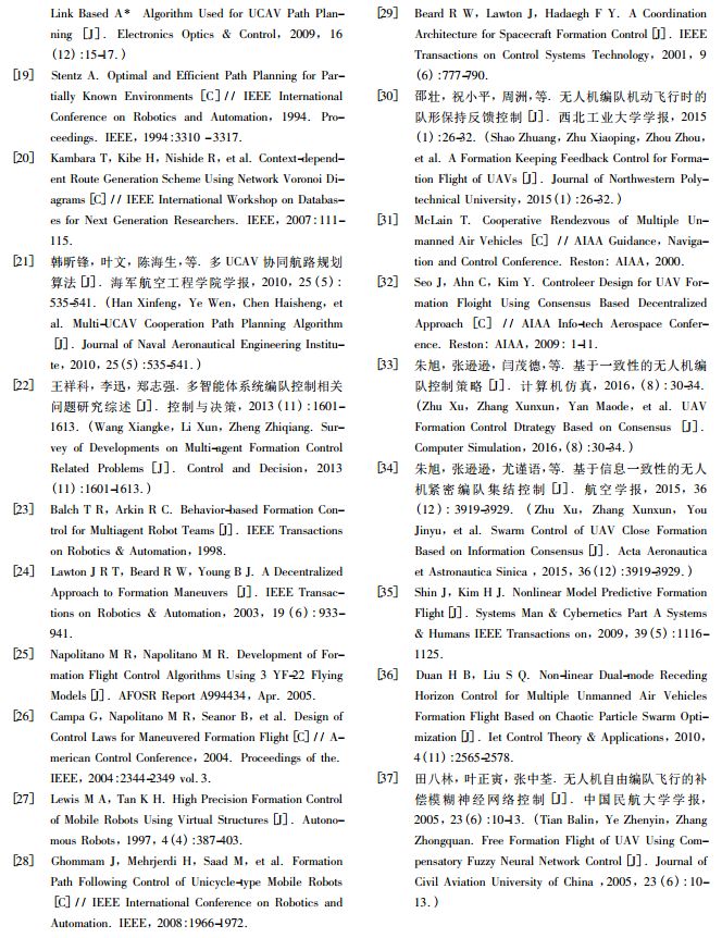 近年,采用分布式结构的基于一致性策略[31-32]的编队控制方法引起了学者的重视。这种方法仅使用邻居的相对信息,编队中可以没有明确的中心节点,通过对编队收敛的时间进行指定可以满足编队快速收敛性的要求。整个编队按照指定的航迹飞行,本质是混合系统在编队的同时实现对航迹的强一致跟踪。朱旭在文献[33-34]中提出了基于一致性的三维编队控制策略,以预定速度和航线作为参考状态,控制精度比较高,抑制了测量误差、协同误差和通信延迟。除了上述编队控制方法之外,Shin J在文献[35]中基于模型预测控制技术设计了Leader-follower based编队控制策略,采用分布式通信结构提升了通信效率,而且文中方法实现了有效避障。段海滨在文献[36]中针对非线性系统提出了一种非线性双模滚动时域控制方法进行无人机编队控制,并采用粒子群优化方法求解得到所有飞行器的控制输入。田八林[37]采用了补偿模糊神经网络控制方法,实现编队飞行中速度控制、队形结构保持和避开障碍物