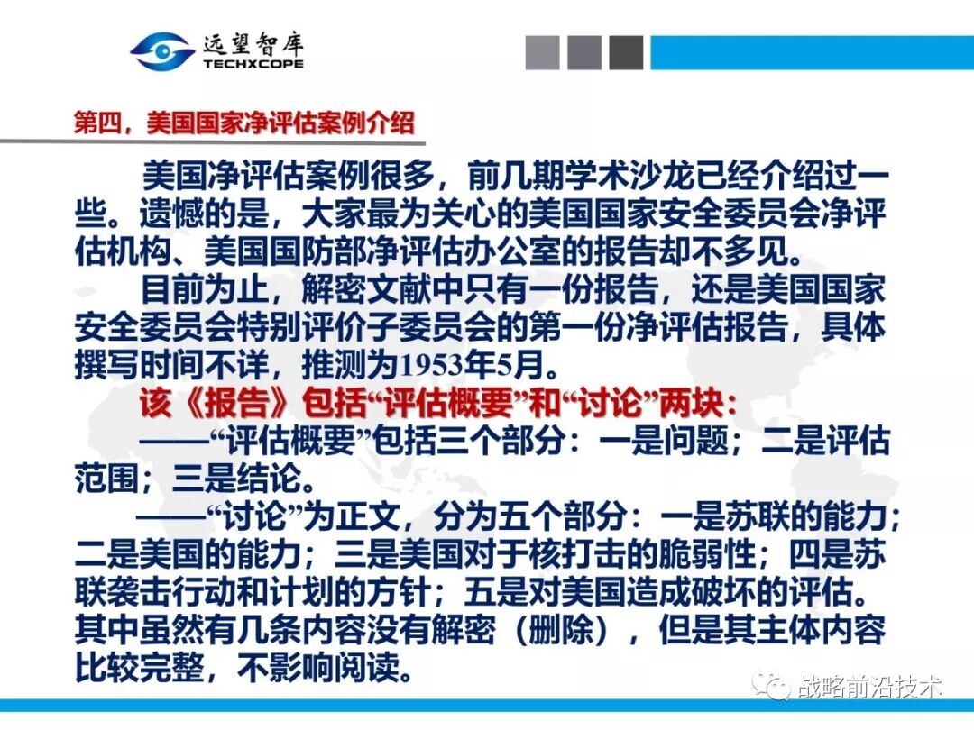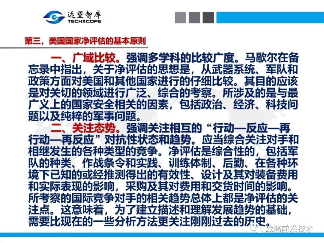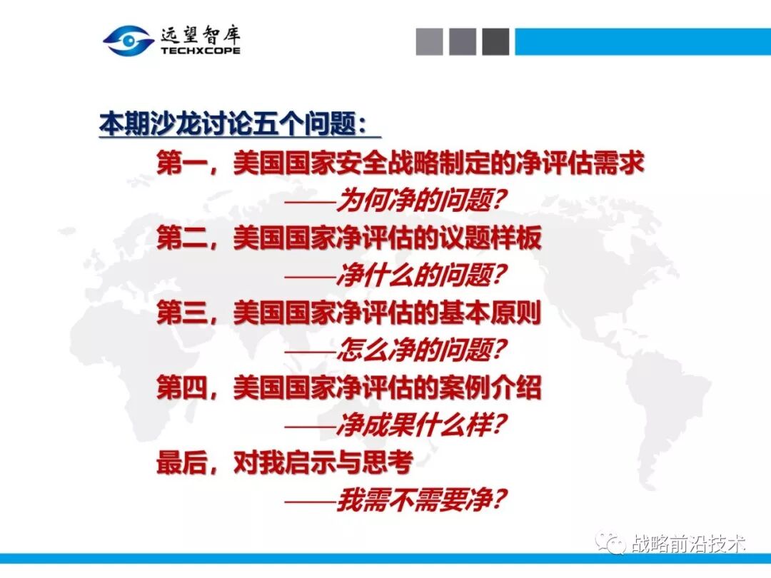 8月29日下午,远望智库以“净评估与国家安全战略问题研讨”为主题,在北京中航广场如期举办了第九期“净评估+”学术沙龙。来自相关领域的专家围绕以下五问题进行了研讨:第一,美国国家安全战略制定的净评估需求——为何净的问题?第二,美国国家净评估的议题样板——净什么的问题?第三,美国国家净评估的基本原则——怎么净的问题?第四,美国国家净评估的案例介绍——净成果什么样?第五,对我启示与思考——我们要不要净?应相关净评估研习者要求,现将本期学术沙龙开始时的引导发言(主旨发言)PPT部分稍加整理、增强可读性,并予以发布,仅供参考。
