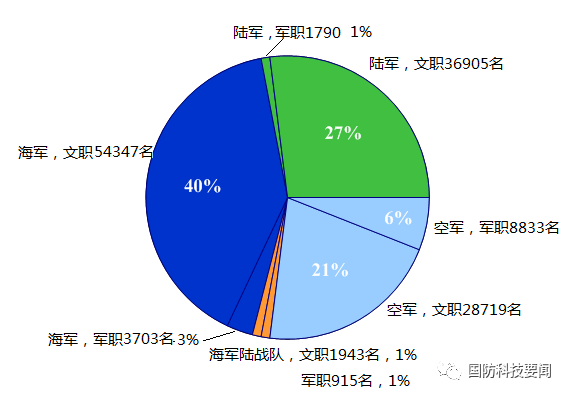 从各军兵种看:海军采办人员总数最多,为58050人,其中文职人员54347人,军职人员3703名,军职和文职人员的比例为1:15.7;其次是陆军,采办人员总数为38695人,其中文职人员36,905人,军职人员1790名,军职和文职人员的比例为1:19;空军采办人员总数为37552,其中文职人员28,719,军职人员8833,军职和文职人员的比例为1:3;海军陆战队采办人员总数为2858,其中文职人员1943人,军职人员915名,军职和文职人员的比例为1:2.1。
