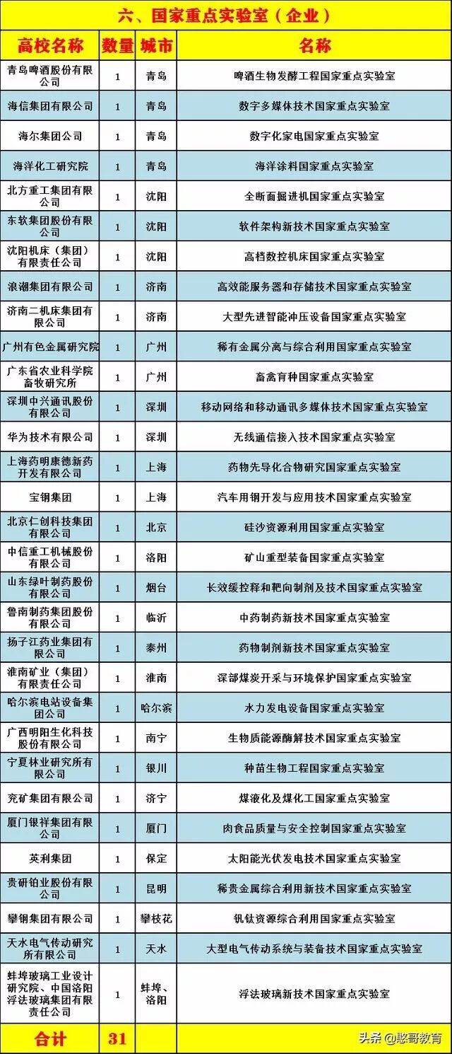 中国建有316个,其中高校171个,中科院67个,国家部委47个,企业31个。布局在企业国家实验室知名的有依托华为公司的无线通信接入技术国家重点实验室。