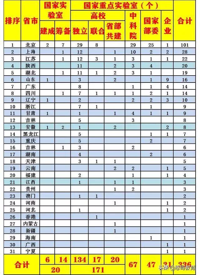 全国有31个省市有国家实验室或国家重点实验室,排名前十的是北京、上海、江苏、陕西、湖北、山东、四川、辽宁、浙江。