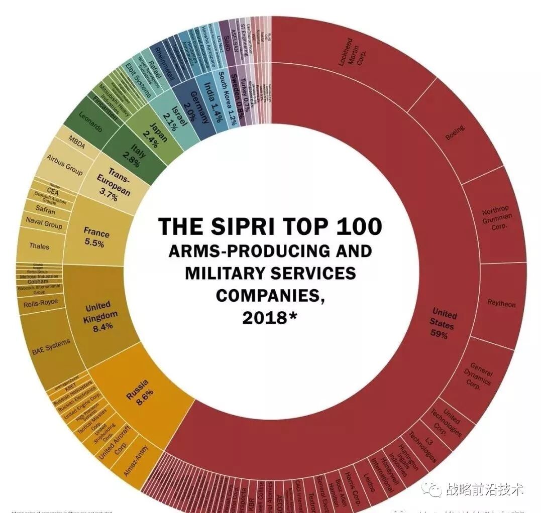 根据对以上中国四大军工公司2017年军售的估计,他们可以与SIPRI全球军工百强进行比较。SIPRI于2019年12月发布的基于2017年度数据的全球军工百强榜主要由美国、西欧和俄罗斯的公司组成:在100家公司中,它们共占76家,军售占比超过90%。在前20强公司中,11家位于美国,6家位于西欧(2家位于法国,2家位于英国,1家位于意大利,1家为泛欧),3家位于俄罗斯(见下图)。![]()