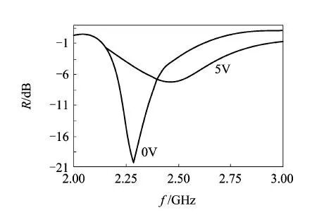 其中,方程左边易导电,右边不易导电,施加电压后向易导电的方向发展,电磁参数发生变化。对于含40% PANi·HBF4的导电聚合物,施加电压后,反射率变化的时间小于100ms,说明该导电聚合物满足反应时间足够快的要求。图10为施加电压前后导电聚合物的反射率变化图。可应用电磁参数可调的导电聚合物来设计基于Jaumann原理的宽频雷达可调雷达吸波体,但其稳定性、调控范围仍有待进一步研究。