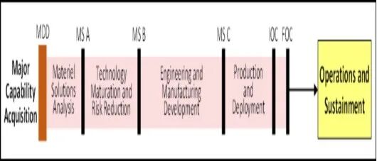 重大能力采办通常遵循结构化的分析、设计、开发、集成、测试、评估、生产和保障程序,适用于重大国防采办项目、大型系统和其他复杂项目的采办。其采办和产品保障程序、评审和文档要求将根据项目规模、复杂性、风险、紧迫性和其他因素进行裁减。可以通过软件采办途径来获取软件密集型组件,并将输出和依存关系与整体的重大能力采办路径集成在一起。图3说明了重大能力采办路径。