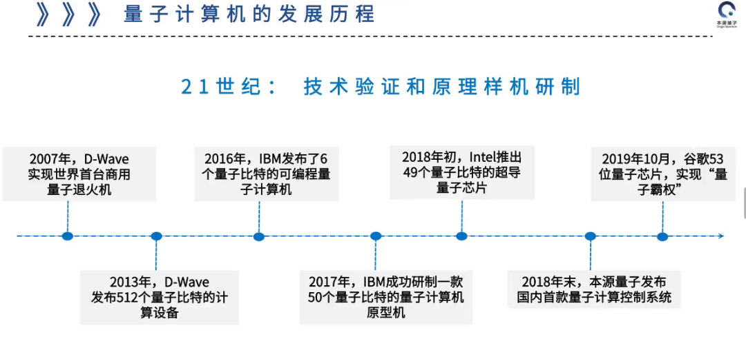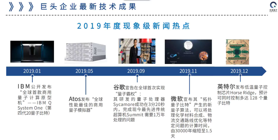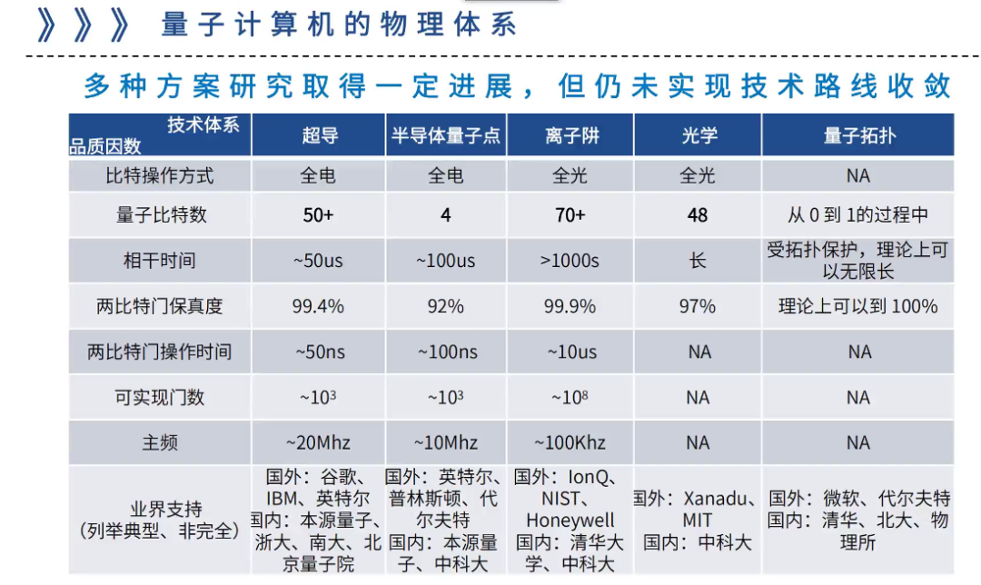 在报告中,张辉提到,量子计算机和经典计算机并不是水火不相容的关系,中国与美国在量子计算方面至少有4~5年的差距,但是并不是“卡脖子”状态....量子力学已经有100多年的历史了,目前量子信息的技术也已经非常多了,包括原子能、激光、超导、晶体管、半导体等等,很多的技术的应用都已经到了量子力学效应状态。历史上量子革命有两次,第一次主要是宏观的量子行为,第二次主要是微观量子技术体系,我们目前的努力也是集中在微观体系。两次革命都是在说明量子不是非常神秘的东西,它是一门非常严谨的科学。量子计算是基于量子力学和计算机的交叉学科,是一个全新的学科。从19世纪80年代开始,欧美已经有科学家提出量子计算机的概念,经过几十年的发展已经有了一些算法,包括破解密码的算法,搜索的算法等等。这些理论构建起了整个量子计算的完备体系。到了21世纪,研究重点是把理论研究带出实验室,最近也可以看到非常多的现象级新闻,这些都是标志。不可否认,量子计算还处在早期发展的阶段,类比经典计算机,今天的量子计算机还处在经典计算机的电子管时代,就连最底层的物理载体还没有完全形成。目前定义量子计算的5项指标,包括量子比特的编译方式、相干时间、操作、时间、输入/输出,未来的可扩展性等参数指标,都不是非常完美的物理体系。量子计算也有非常多的体系,每一个体系都有它本身的优缺点,比如离子阱,优势是量子比特品质高,相干时间较长,量子比特制备和读出效率较高,缺点是储存少,消相干,可扩展性差,小型化难等等。注:相干时间指在量子效应保证的时间里,对其进行操作的时间,这个时间当越长越好。在光学体系里面,其优势包括相干时间长,操纵手段简单,扩展性好。缺点是两个量子比特之间的逻辑门操作难。还有拓扑,它的优势包括,对环境干扰噪音、杂质有很大的抵抗能力,但它目前还停留在理论层面,无器件化实现。在学术界和工业界,虽然多种方案研究都取得一定进展,但仍然没有实现技术路线收敛。目前进展最快、最好的技术是超导电路。这有两个原因,第一个是人类很希望借助现在非常先进的技术促进发展,包括半导体集成、电路工艺和技术。第二个原因是它的优势是可扩展性非常强,固态器件、电学方向能够使未来的量子计算与经典的计算机相兼容、融合。谷歌、IBM、英特尔这些公司都把精力放在了超导或者半导体方向。对比一下,经典计算机是编译在一个宏观的体系上,主要用高电压和低电压来表示0和1。量子计算机未来是编译在原子或者是电子这种微观的体系上。比如用电子来编译0和1,用上下电子自旋状态来表示0和1。计算机的发展中晶体管越做越小,已经把工艺推进到7nm、5nm,甚至有人说要做到3纳米。直接面临的最困难问题是晶体管的尺寸越做越小,中间的阻隔变得越来越薄,已经做到5纳米的时候,原子数只有几十个了。(3nm的话,会有十几个。)在微观体系下,电子会发生量子的隧穿效应,不能很精准表示0和1,电子不能精确定义高低电压,会来回乱跑,这也就是通常说的摩尔定律碰到天花板的原因。解决方法是换材料,比如原来用土,现在换用塑料。换用塑料会让阻隔越来越结实,但是到了微观体系,原子级别,无论用什么材料,都无法阻止电子隧穿效应,现在的科学家要么极力避免量子效应,要么干脆利用量子力学。量子计算机有两个最大的优势,第一个是可以为海量数据的并行计算(性能)带来指数级别的提升,这种强大的功能,可以运用在包括金融、数据的搜索处理等领域。第二个优势是量子计算编译在电子原子上,在模拟方面会表现的非常自然,例如新材料的发现,生物医药的药物合成。量子计算发展其实也就是最近两三年的时间,欧洲、亚洲、北美、澳洲的一些发达国家,几乎都会涉及到量子计算的方向,很多国家已经上升到了国家层面,比如像美国已经把量子计算提升到阿波罗登月计划的高度。从企业的角度来看,比较大的IT公司,例如谷歌、IBM、微软、英特尔、以及国内的腾讯、阿里巴巴、百度、华为,几乎都会涉及到量子计算,并且全球已经有上百家的量子计算创业公司,发展非常快速,也已经有非常好的成果展现。量子计算机可以和经典的电子计算机类比,量子芯片对应中央处理器,量子测控体系对应计算机的主板。还会有很多的量子软件,包括操作系统,包括底层的汇编语言、操作指令,包括未来基于这些汇编语言开发的量子应用软件算法。2019年是量子计算发展的高光时刻,谷歌的量子霸权可以类比当年人工智能的阿尔法狗下围棋。正是由于AI下围棋打败了人类,才把人工智能推到了一定的发展高度。专家们认为谷歌的量子霸权,完全有可能点燃量子计算热潮。2019年年初,IBM推出了20个比特的量子计算原型机,并且已经开始售卖。2019年年底,谷歌的量子霸权,仅仅只用了53位的专用量子芯片就解决了一个数学问题。专利方面也有很多进展,加拿大的D-Wave获批了300多项,IBM也有235项,微软有212项,本源量子作为中国唯一上榜企业有36项。从量子计算角度看,中国和美国至少还有4~5年的差距。但现状比经典计算机好了很多,至少不会被人“卡脖子”。(量子计算机)商用预测大概会分三个阶段,当前第一阶段已经走完。在量子计算的原型机的开发这一水平上,谷歌提出的量子霸权是标志性事件。第二阶段是