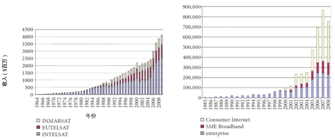 图1 INTELSAT、EUTELSAT和INMARSAT的年收入(左)VSAT终端的年销量(右)