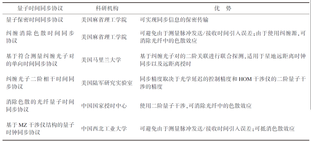 理论研究发现,在相同条件下,量子时间同步精度极限比经典时间同步极限提高MN倍(N为一个脉冲中包含的平均光子数,M为脉冲数)[18]。量子时间同步协议精度理论上可达到ps量级。因此,国内外多家研究机构开展了基于量子效应的时间同步协议,表2列举了目前提出的几种量子时间同步协议的方案。量子时间同步协议的研究仍处在实验室验证阶段,很多核心技术和关键问题有待突破,比如大量处于纠缠态的光子对的制备等。