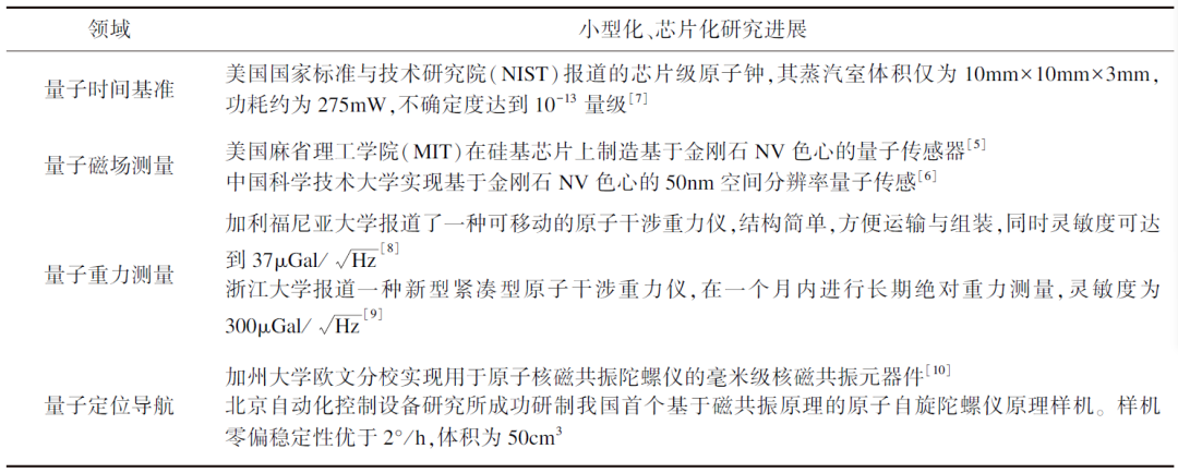 以上两类量子测量技术的小型化、实用化、芯片化已成为研究热点,表1展示了近些年国际和国内在小型化、芯片化方面的研究成果。小型化、芯片级、低功耗的高精度量子测量装置为量子测量技术进一步实现商用奠定了基础。