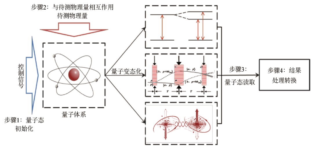 量子测量技术利用特定的量子体系(如原子、离子、光子等)与待测物理量(如磁场、重力场等)相互作用,使之量子态发生变化,通过对体系最终量子态的读取及数据后处理过程实现对物理量的超高精度探测。基本可以分为量子态初始化、与待测物理量相互作用、最终量子态的读取、结果处理等关键步骤,具体参见图1。量子态的初始化是通过控制信号将量子体系调控到特定的初始化状态;与待测物理量相互作用后会导致量子体系的量子态发生变化,直接或间接的测量最终的量子态,再将测量结果处理转换成传统信号输出,获取测量值。量子测量技术应具备以下基本要素:一是“测量工具”是量子系统,如单光子、纠缠光子对、原子、离子等;二是“测量工具”与测量对象之间相互作用,使其量子态发生变化,并且这种变化是可以通过直接或间接手段读取的。按照对量子特性的应用,量子测量可分为基于量子能级跃迁、基于量子相干性、基于量子纠缠的3种量子测量技术。