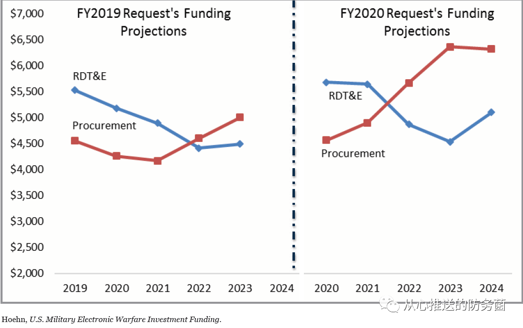 美国现在正进入一个时代,EMS的优势将需要作为多域战的一个组成部分来及时获取并长期维持,这就是EMS机动战的时代。可以毫不夸张地说,无限的EMS机动自由对世界各国的军队和社会至关重要。它支持现代生活的高速接入互联网、驾驶导航等等。对于军方来说,EMS能够实现精确制导、遥控无人机、自适应后勤、现代雷达、通信和无数其他应用。电子战(Electronic Warfare,EW)需要以更机动的速度发展,这也增加了EMS地带的复杂性。在过去的20年里,EMS作为一个作战域的概念逐渐成熟,同时也成为现代生活中普遍存在的一部分,尽管大多时候被人们所忽视。在军事领域,由于多年来预算紧缩,导致电子战系统发展停滞,美国在EMS作战域的优势开始动摇。17年来,美军一直在高度宽松的环境中作战,这一点导致了其在武器系统开发和作战计划中缺乏对EMS的足够考量。与此同时,美军认为其匹敌者一直在研究美国如何在波斯尼亚、阿富汗和伊拉克作战,并据此发展了相应的理论和武器来制造在这一新兴领域的不对称优势。美军五年电子战研发、测试、评估和采购资金(2019-2024)