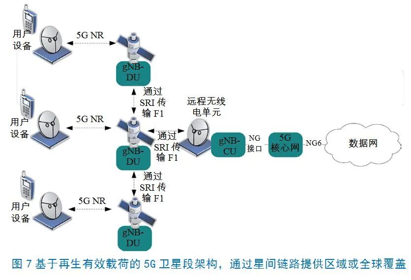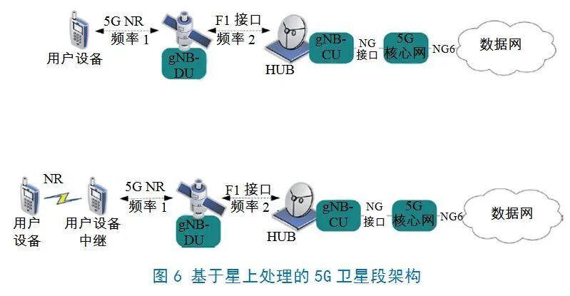 图6显示了基于星上信号处理技术实现的5G卫星段系统架构(在卫星上部署部分基站处理设备),星上信号处理有效载荷使用5G基站的分布式模块gNB-DU,卫星链路使用5G NR无线电接口。