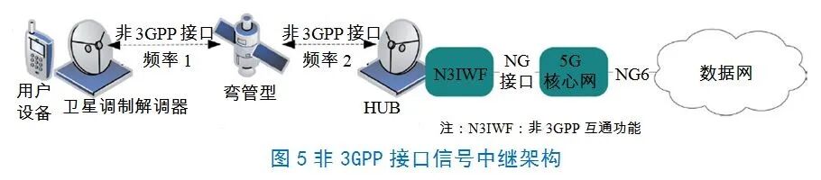 在5G用户设备(UE)有机会使用非3GPP无线接口的卫星调制解调器构建弯管型5G卫星段架构时,架构设计可如图5所示。5G卫星段架构应支持不同配置,其中无线接入网可以是卫星NG-RAN或非3GPP卫星接入网,或同时采用两种。