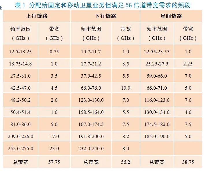 2019年世界无线电通信大会(WRC-19)为全球5G地面网络分配了24.25~27.5GHz、37~43.5GHz和66~71GHz毫米波频段。在一些国家和地区,45.5~47GHz和47.2~48.2GHz频段补充分配给了IMT地面部分。这一决定允许5G卫星和5G地面网络在频谱共享基础上使用部分毫米波频段。