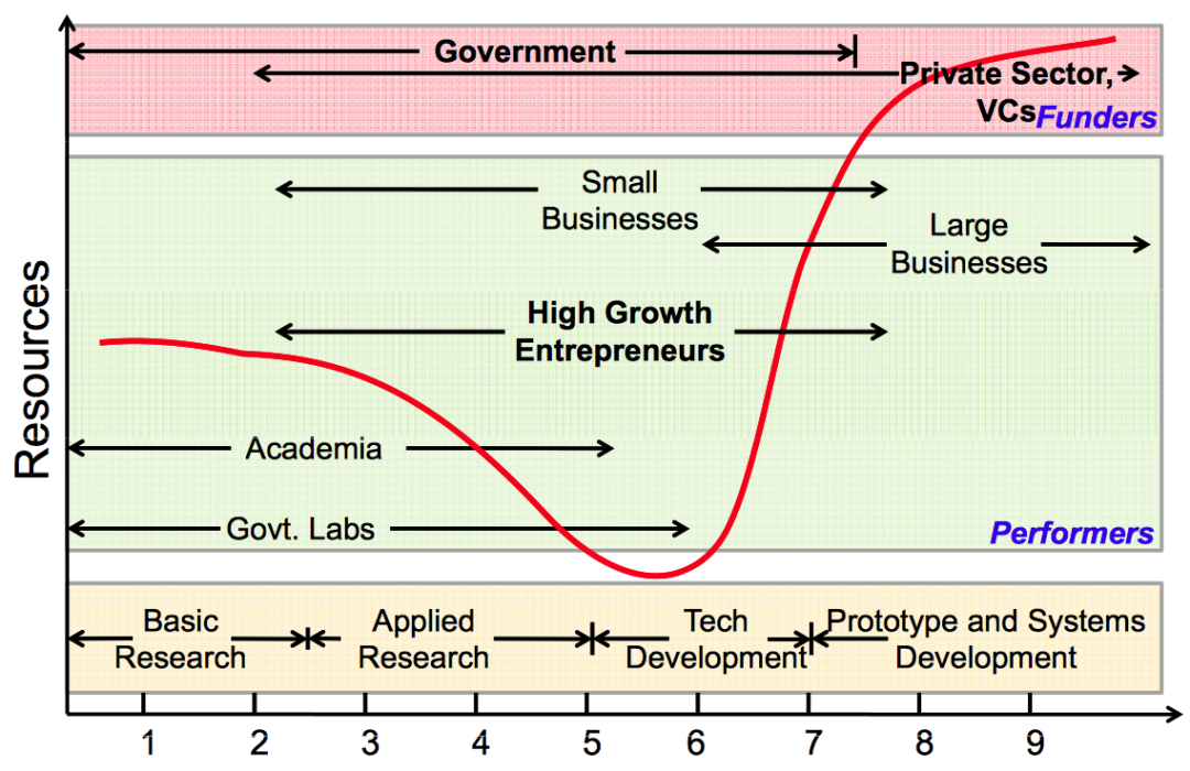 不过,基础技术在科研成果转化过程中,研究者的作用是由强到弱的,而企业作用由弱到强。中间有一个薄弱地带(TRLs模型的4-7级),被称为“死亡谷”。