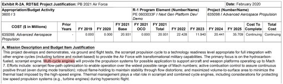 美空军2021财年预算文件在“下一代平台研发与验证计划”(编号:PE 0603033F)/“先进航空航天项目”(编号:635098)/“超燃冲压发动机技术”专题中安排了“多循环发动机”(Multi-cycle engine)研究条目。文件提到,多循环发动机可为飞机和导弹提供推进系统,使其飞行速度达到Ma7。仅从图中上下文来看,“多循环”可能对应的是某种组合发动机,如TBCC发动机(美空军2021财年预算文件截图)
