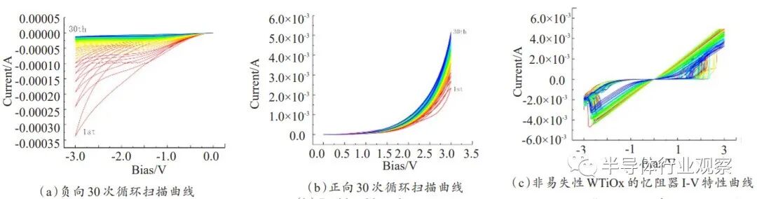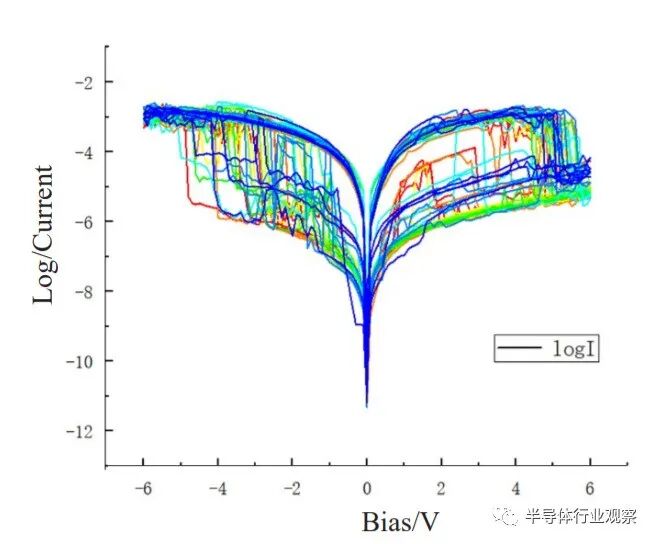 图1.不同镍铜比下,铜镍合金生长石墨烯在300nm二氧化硅衬底表面的拉曼光谱与对应的光学显微镜图片镍比铜有着更好的催化性[57],因此,随着镍组分的升高,石墨烯的缺陷逐渐减少,质量逐渐升高。同时,我们也发现随着镍组分的升高,石墨烯的颜色变得更深且更加不均匀。不同层数的石墨烯在300nm二氧化硅上会显现出不同的对比度[58],因此,颜色变深代表石墨烯的层数逐渐增多,颜色不均匀代表石墨烯的层数分布的不均匀。我们发现造成这种现象的原因主要是碳原子在铜表面的扩散速度高,而在镍表面的扩散速度低。对于镍组分低的样品,碳原子的表面扩散速度快,因而可以在极短的时间内就生长成连续的石墨烯薄膜,当石墨烯长满金属表面后,金属被石墨烯包裹,隔绝了与甲烷的接触,金属的催化作用消失,生长速度被极大地放缓。虽然等离子体的存在使甲烷仍在不断裂解,但是失去了金属的催化作用,石墨烯的生长速度变得极为缓慢。对于镍组分高的样品,碳原子在其表面扩散速度慢,因而碳原子会在石墨烯的成核点处堆积。相比于镍组分低的样品,石墨烯长满需要更长的时间,在这个过程中,金属的催化作用一直存在,同时由于镍组分的提高,合金的催化性也会提高,因此石墨烯的生长速度会更快,更长的催化时间和更快的生长速度,导致石墨烯的厚度很厚,且不均匀。举一个形象的比喻来说,就是把一杯水倒在一个平面上,水会在平面上很快地流动形成一层均匀的水膜,但是当把一杯沙子倒在平面上的时候,沙子则会在平面上堆积,如图2[54]所示,碳原子在铜表面的扩散就相当于“把水倒在平面上”,而碳原子在镍表面的扩散就相当于“把沙子倒在平面上”。因而,如果要提高石墨烯的质量需要选用高催化性金属,针对铜镍合金来说,需要提高铜镍合金中的镍组分。若要提高石墨烯的均匀性,需要选用碳原子在其表面扩散速度快的金属,针对铜镍合金来说,需要减小铜镍合金中的镍组分。因此两者是矛盾的,在实验中发现,选用镍比铜1:2的组分会得到一个相对较好的结果。此外,等离子体增强技术本身也对石墨烯的质量影响巨大。如图3(a)所示,有等离子体和没有等离子体的生长结果中,石墨烯的D峰相差巨大。这是因为没有等离子体辅助,甲烷也能裂解,但是不能完全裂解,会产生CH3、CH2这样的中间产物,导致石墨烯质量降低。通过对等离子体生长功率的优化,能够一定程度地提高石墨烯质量。如图3(b)所示,在不同等离子体功率下,50W生长出的石墨烯的D峰最小,质量最高。需要说明的是,50W的功率并不是一个绝对的条件。如图3(b)和(c)是生长腔室和生长过程中的图像,等离子体电极在加热器下方。通过调节等离子体电极与加热器的距离,可以调节生长时在样品表面周围的等离子体强度。因此,50W的功率只对应于当前等离子体电极和加热器距离下的最佳功率[54]。在本文中,只列举的铜镍合金低温下催化生长的石墨烯时,铜和镍组分选取的理由,即既要兼顾催化性,又要兼顾碳原子的表面扩散速度。金属种类多种多样,通过对各种金属的研究,或许能找到比铜镍合金更好的合金选择。WTiOx作为忆阻器开关层,可以通过WTi靶材经过在不同氩氧比例的气体氛围下反应溅射制备薄膜,磁控溅射反应设备及反应腔室内部如图4所示。我们所制作的钨基忆阻器的功能层材料是在功率300W、时间220s、Ar2通量20sccm的条件下通入不同浓度的氧气,实验发现通入的氧气越多,薄膜厚度越薄,如图5所示。之后通过控制时间的长短,可以控制不同氧气通量下的薄膜厚度。制作出的WTiOx薄膜在纯N2氛围下退火30min,提高薄膜结晶度。基于钨氧化物的忆阻器显示出许多优势,包括逐渐改变电阻状态和记忆和学习功能。然而,较多先前的报告侧重于研究突触学习规则,而不是专注于分析导致外部学习规则的内部机制。在此,讨论堆叠的Au/WTiOx/Au和Ti/WTiOx/Au器件,其中通过外部诱导的氧离子的局部迁移实现电阻开关的功能。结果表明,Au/WTiOx/Au器件的连续可调多级电阻是由于高氧空位浓度下势垒宽度和高度的变化;而Ti/WTiOx/Au器件由于导电丝在低浓度氧空位中的连接和断裂而表现出器件的高和低电阻状态。通过控制离子迁移的物理机制构建和多态的突触发展 ,可以深入理解基于氧化物的忆阻器在神经形态计算中的应用。图6为测试结果。在已有的研究中,基于卤化物-钙钛矿的电学器件的电流-电压(I-V)性能中经常发现不良的滞后现象。点缺陷,如间隙、空位、反位及其迁移被认为是钙钛矿材料电学迟滞的原因。忆阻器是基于缺陷工作的器件,因此,卤化物钙钛矿材料在忆阻器领域具有很广泛的应用前景。近年来,研究者开展了许多令人兴奋的研究,实现了具有优良性能的卤化物-钙钛矿基忆阻器件。然而,这些卤化物钙钛矿忆阻器的器件尺寸通常为数十微米,主要通过借助硬掩膜版制作。在本工作中,使用CMOS兼容的光刻工艺,制作了一个具有2μm顶电极的CsPbBr3基忆阻器,器件的三维结构示意图如图7所示。可以看到忆阻器包含底部电极、CsPbBr3膜和顶部电极的交叉结构。在CsPbBr3薄膜表面引入Parylene薄膜作为保护层,既可用于制作小尺寸顶电极,又可提高器件在空气中的稳定性。图7.利用光刻工艺制作CsPbBr3忆阻器的三维结构示意图图8展示了利用光刻工艺制作的CsPbBr3忆阻器的光学显微照片。可以看到下电极和上电极,表明Parylene和CsPbBr3