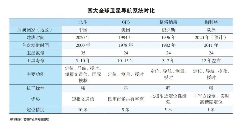 目前,除了我国北斗卫星导航系统外,全球以建成的全球范围导航系统还有美国GPS系统、俄罗斯格洛纳斯卫星导航系统(GLONASS)以及欧洲伽利略系统(Galileo)。四大系统发展路径各不相同,特点各有千秋。