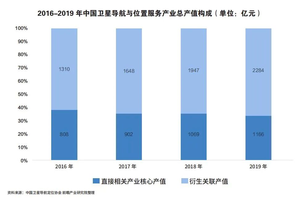 2019年,与卫星导航技术研发和应用直接相关的产业核心产值为1166亿元,在总产值中占比为33.8%。虽然受到多重客观因素影响,核心产值增速明显放缓,但随着“北斗+”和“+北斗”应用的深入推进,由卫星导航衍生带动形成的关联产值继续保持较高速度增长,达到2284亿元,有力支撑了行业总体经济效益的进一步提升。