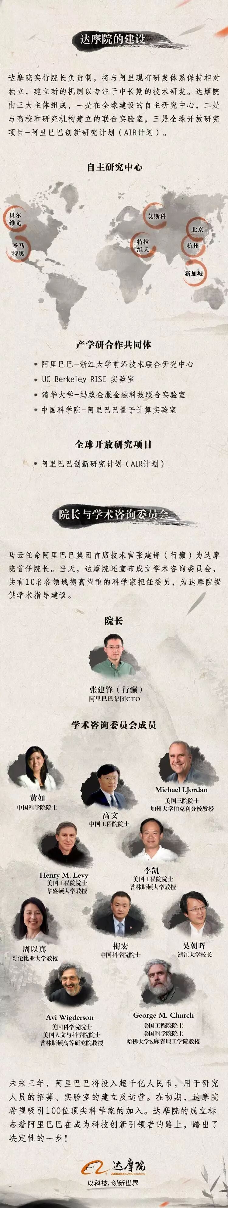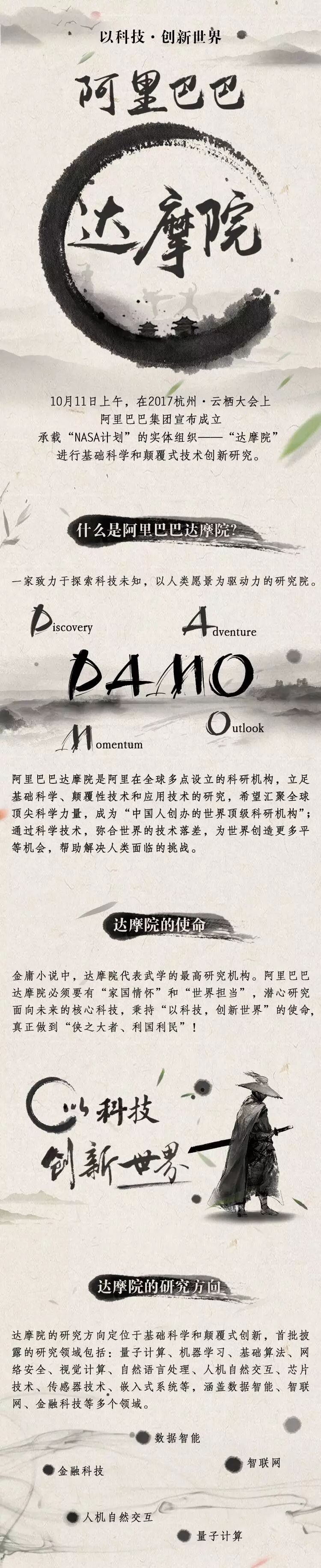阿里巴巴达摩院由阿里CTO张剑锋(行癫)发布,将进行基础科学和颠覆式技术创新研究,预计3年投资1000亿人民币,面向全球吸引人才。
