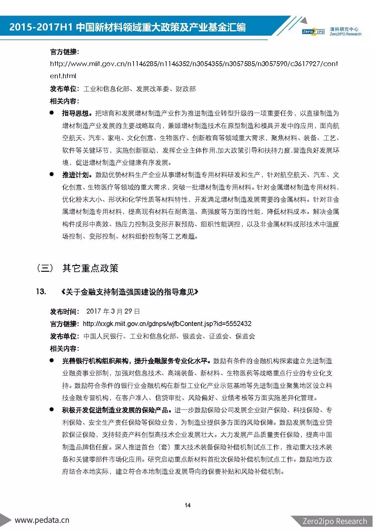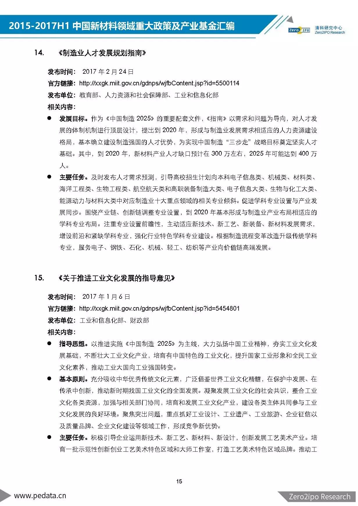 财政、科技、教育等部门大力支持新材料产业发展。2017年3月29日,中国人民银行、银监会、证监会、保监会发布了《关于金融支持制造强国建设的指导意见》,支持新材料产业发展。2017年2月24日,教育部、人力资源和社会保障部、工业和信息化部发布《制造业人才发展规划指南》,也指明了未来新材料产业的人才缺口和培养计划。另外,国务院、财政部、工信部等部门也出台多项政策,分别从各自领域对新材料产业的发展提供大力支持。