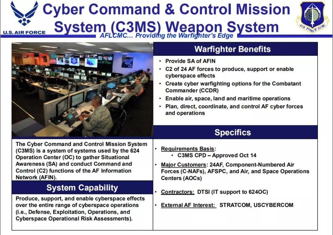 2017年3、4月间,美国空军先后与雷神公司、诺斯罗普•格鲁门公司和博思艾伦汉密尔顿控股公司签订总额2800万美元合同,建造网络指挥和控制任务系统(C3MS),从而提高部队网络攻击能力。CM3S位于圣安东尼奥拉克兰空军基地,这里也是负责运行并防御美国空军网络的美国空军第24航空联队所在地。C3MS作为一种顶层系统,主要负责指挥和控制美国空军的网络空间防御武器系统、网络安全和控制系统计划、空军内联网控制系统。C3MS不仅能加强美国空军网络安全和信息处理系统的保护,还覆盖了进攻性网络空间行动、广泛的现实世界和网络域监控能力,并与包括美国网络司令部在内的关键网络指挥部门展开紧密合作。美国空军表示,C3MS系统可向世界各地的战斗指挥官提供永久作战支持,从而将美国空军的到达能力、影响力和警戒性扩展至全球网络域。其中,诺斯洛普•格鲁门公司将负责开发网络任务平台(CMP)。该平台是空军进攻性网络操作的硬件和软件托管平台。雷神公司负责建造C3MS操作中心,而博思艾伦公司负责研究将高功率电磁环境应用到空军网络战和电子战中。按计划,C3MS将于2018年4月完成。