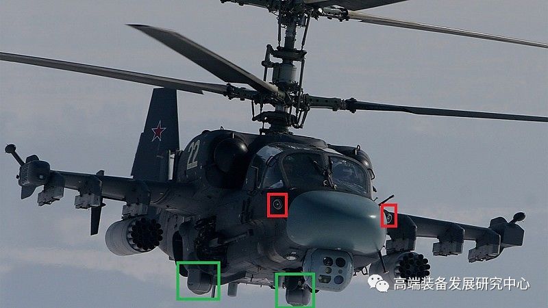 安装在Ka-52直升机上的Vitebsk:绿色为L370-5 光电抑制站,红色为L370-2紫外线检测器