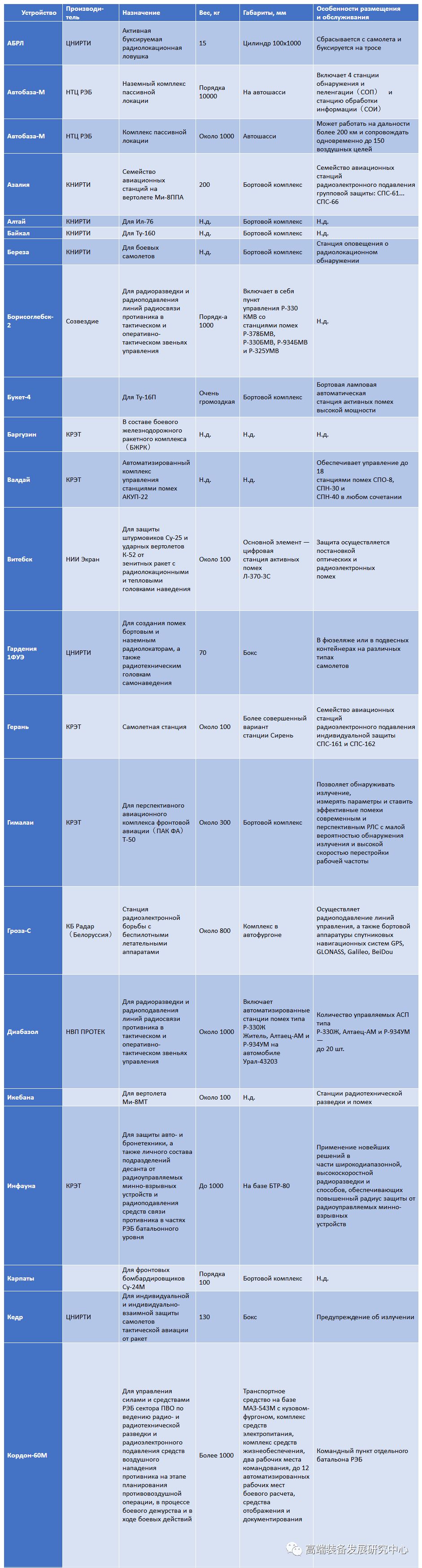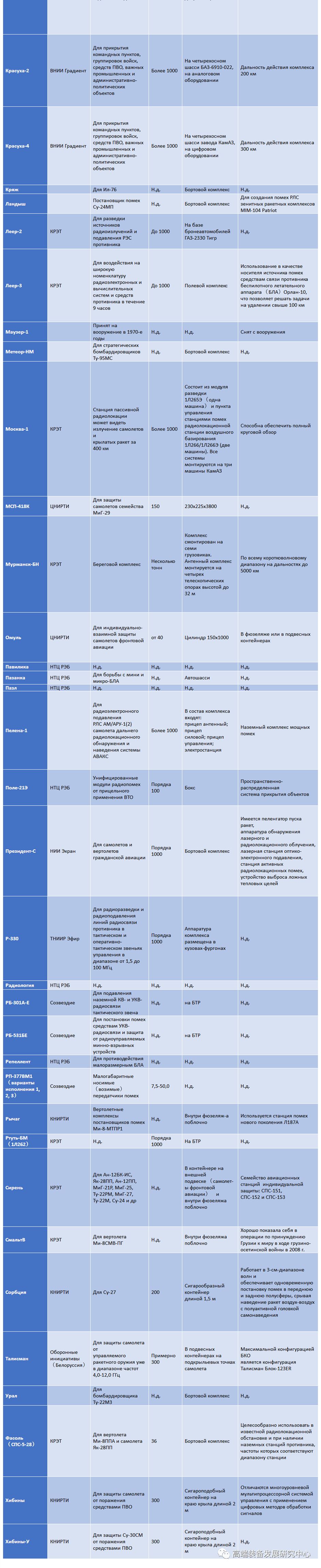 为俄罗斯联邦国防部制造的电子战技术设备中电子战集成系统聚合了大约50种不同用途的综合体和手段(参见表格)。