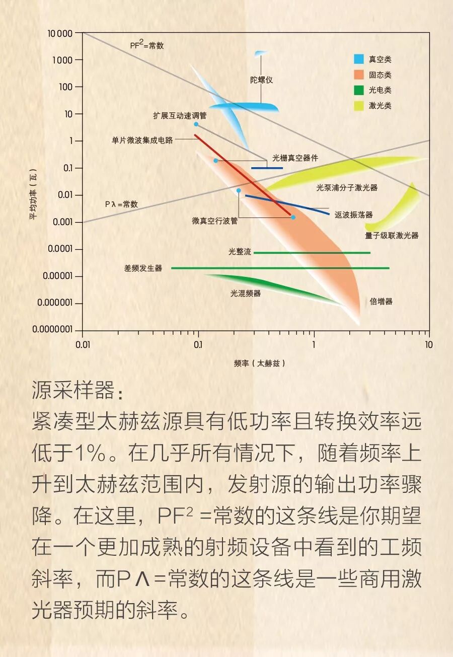 然而,我们在2007年审查的多数电气太赫兹源的功率—频率变化曲线则更为陡峭,基本上在进入到太赫兹范围内时就跌到谷底了。在一般情况下,功率与频率的倒数的四次方(或更高次方)成正比,这意味着,随着频率翻倍,输出功率将会下降至原来的1/16。因此,一个可以在100千兆赫产生几瓦的设备,在达到1太赫兹时只能产生几百微瓦。而在太赫兹波段,激光类设备功率的下降速度比你预计的还要快。