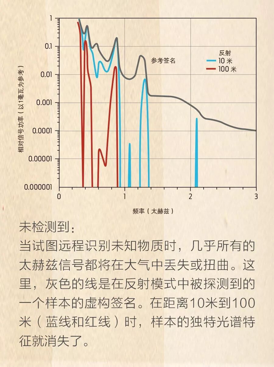 比如你是一名处理危险品的工作人员,你收到了有可能发生沙林毒气袭击的报告。显然,你希望保持一定的距离,因此你拿出可靠的便携式T波波谱仪,类似于《星际迷航》里的三录仪。它向那团气体发出太赫兹辐射的定向波束;气体就会吸收这种带有特性频率光谱签名的辐射。与使用窄带信号的通信和雷达不同,你的光谱仪会发出一个从约300千兆赫到3太赫兹的宽带信号。当然,为确保该信号能返回到光谱仪,它需要穿过气体云进行反射,如在建筑物、容器、甚至树木上进行反射。但在上述情况下,当信号到达气体云再返回探测器时,大气会削弱信号的强度。而由于一种被称为压力增宽的效应,大气也会抹去气体云的光谱特征。即使仅有10米的距离,这一效应也有可能会使获得准确的读数非常困难。而另一个困难是,蔗糖和部分塑料炸药等一些材料的化学签名非常没有特点,这就使得区分它们异常困难。