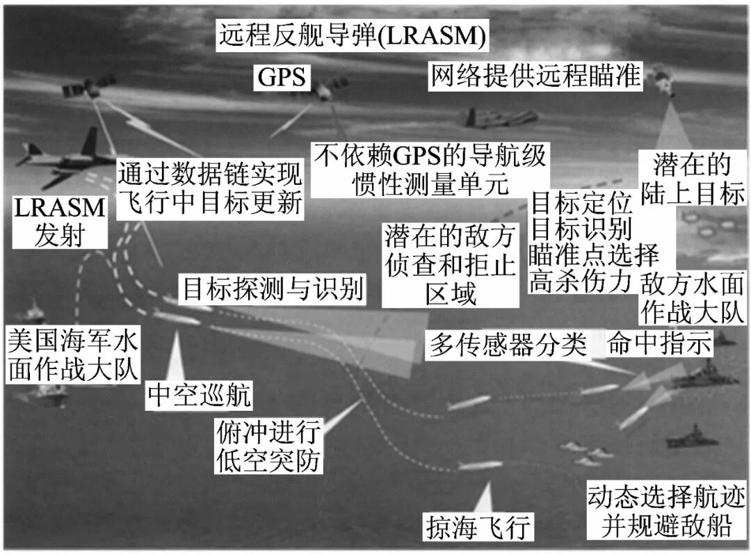 代表美国下一代反舰导弹方向的LRASM导弹可执行不同打击任务,将是一种智能化的导弹。LRASM导弹能依靠先进的弹载传感器技术和数据处理能力进行目标探测和识别,弹载设备中包含GPS接收机、数据链路等,能在无任何中继制导信息支持的情况下进行完全自主导航和末制导,智能完成打击任务。