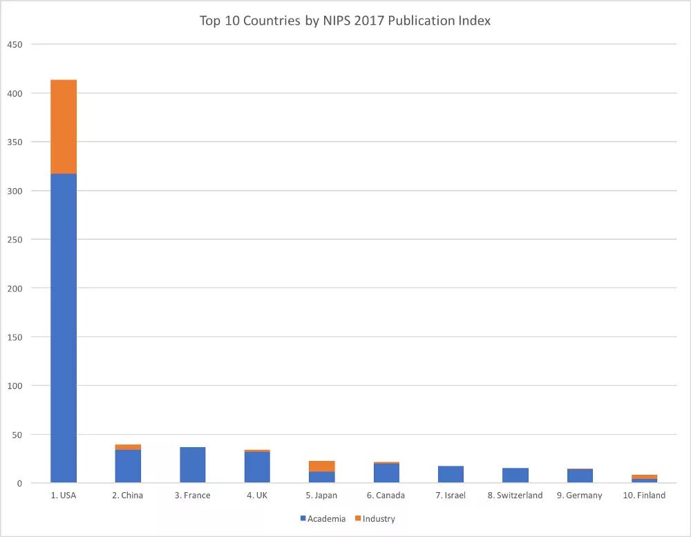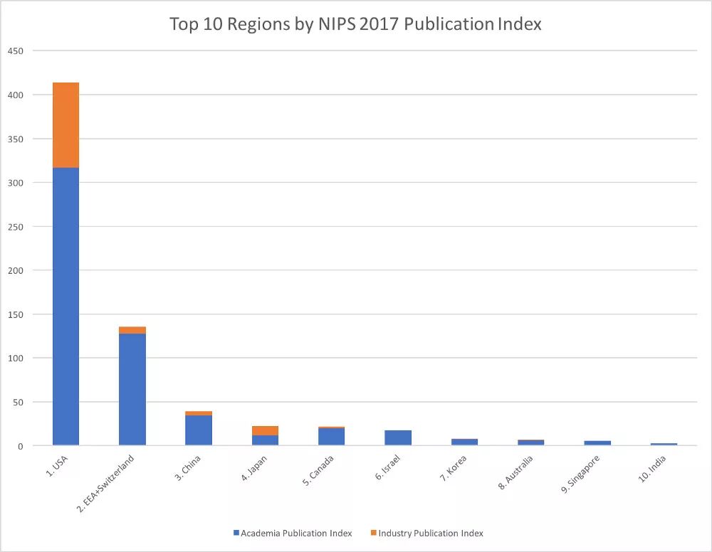 在NIPS 2017上发表了AI研究的前10大地区(蓝色为学术发表指数,橙色为行业发表指数)