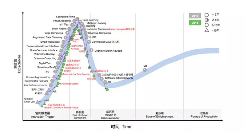 近期,Gartner发布了2018年新技术成熟度曲线(见下图),揭示了5大新兴技术趋势:① AI普惠化;②数字化生态系统;③DIY生化黑客运动;④透明的沉浸式体验;⑤无所不在的基础设施。