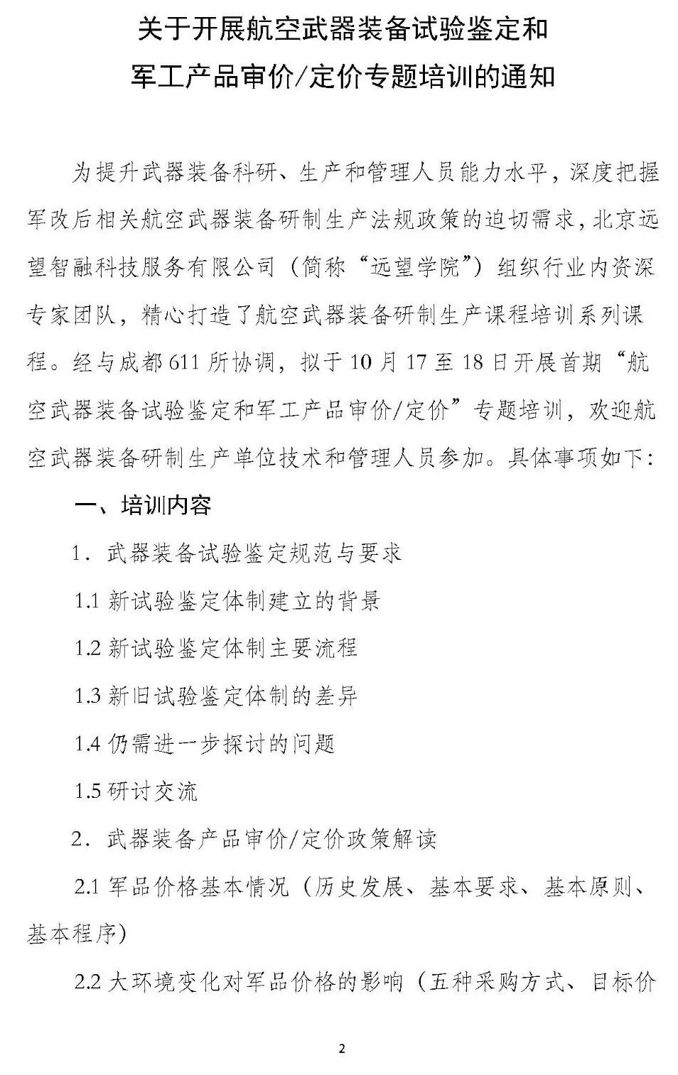 为提升武器装备科研、生产和管理人员能力水平,深度把握军改后相关航空武器装备研制生产法规政策的迫切需求,北京远望智融科技服务有限公司(简称“远望学院”)组织行业内资深专家团队,精心打造了航空武器装备研制生产课程培训系列课程。经与成都611所协调,拟于10月17至18日开展首期“航空武器装备试验鉴定和军工产品审价/定价”专题培训,欢迎航空武器装备研制生产单位技术和管理人员参加。具体事项如下: