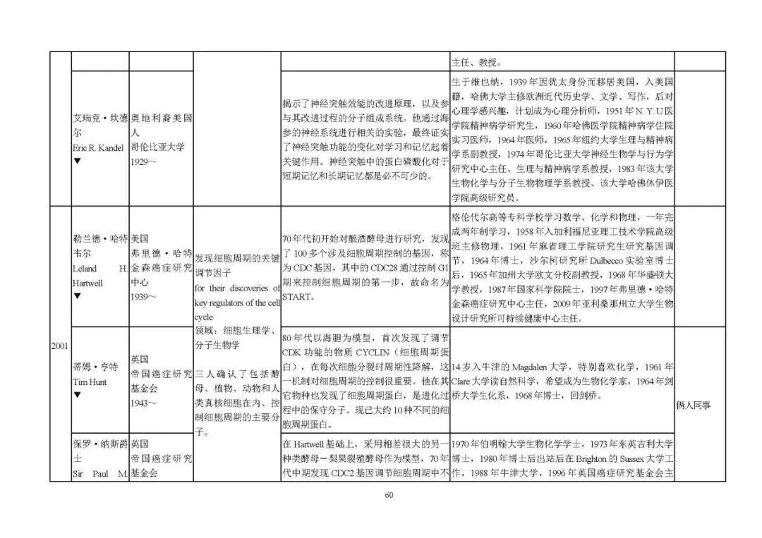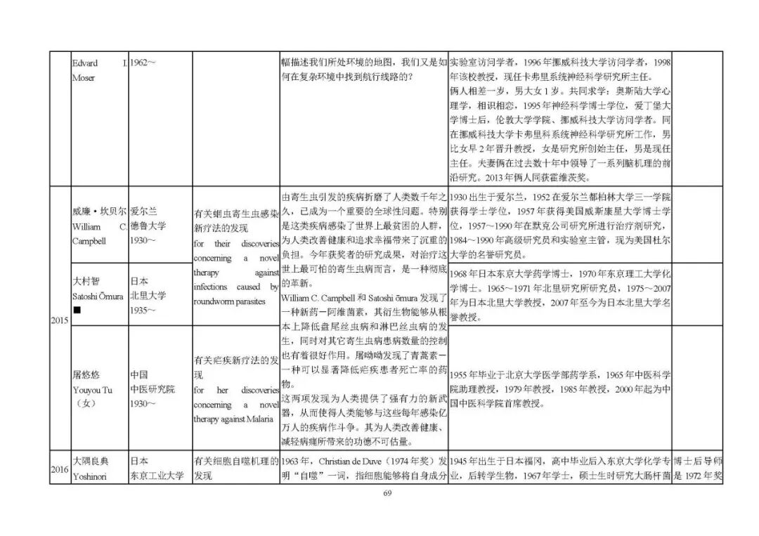 注1、摘自段志光等. 诺贝尔生理学或医学奖获得者成功之路. 科学出版社,2015.9。摘录数据截止于2014年,吴文健补充2015年后的数据。
