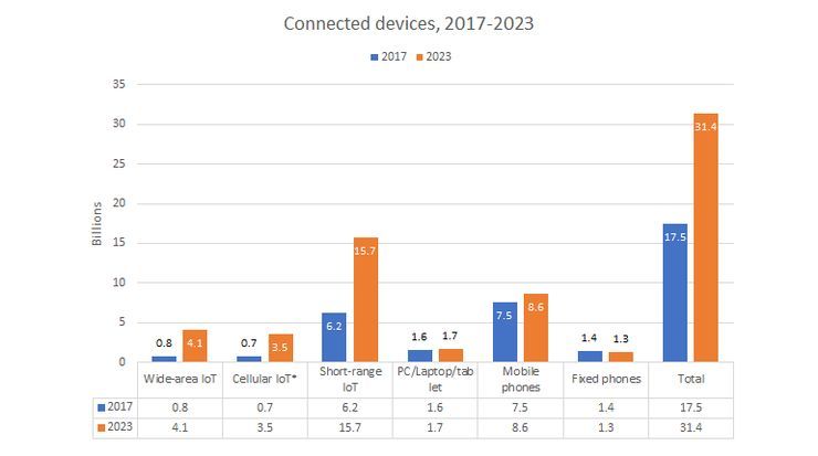 虽然个人电脑、笔记本电脑、平板电脑和(在较小程度上)移动电话在2017年至2023年期间呈现持平增长,但物联网设备正在起飞:那些具有广域连接的设备将实现30%的年复合增长率,短距离物联网设备增长放缓(17%年复合增长率)。这导致2017年(175亿)和2023(314亿)之间连接设备数量增加了近80%(79.4%)。