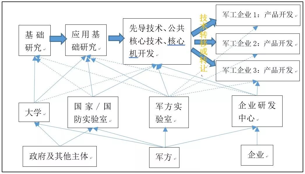 由上图可见,国家/国防实验室及军方实验室向产业界(企业)转移转让军品研制技术是保持军工企业武器装备研发集成能力和保持军工行业竞争性的重要基础[3],当然这也是军方控制军工企业或军工集团的一种重要手段[4]。