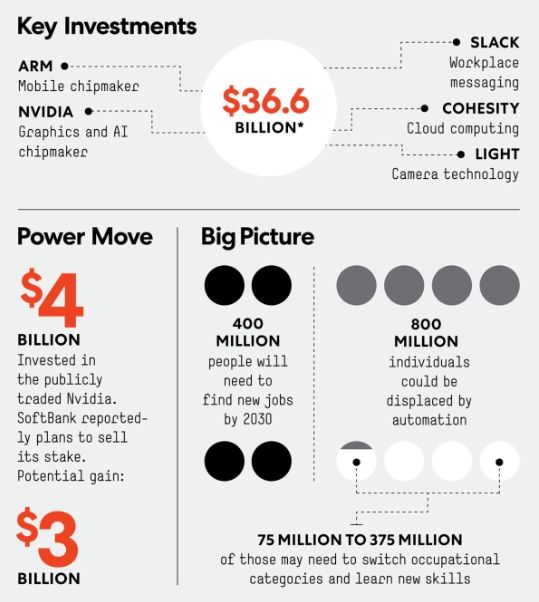 然而,在这背后却隐藏着一个更为复杂的故事。孙正义认为,计算机将比人类更聪明地管理地球。未来学家雷·库兹韦尔(Ray Kurzweil)创造了“奇点”这个词,用来描述计算机接管世界的那个时刻。他预测,到2040年,“奇点”将会成为现实。愿景基金可能帮助提前这个日期。孙正义正在向应用AI和机器学习的人和公司注入庞大的资本,以优化影响我们生活的每个行业,从房地产到食品再到交通等。
