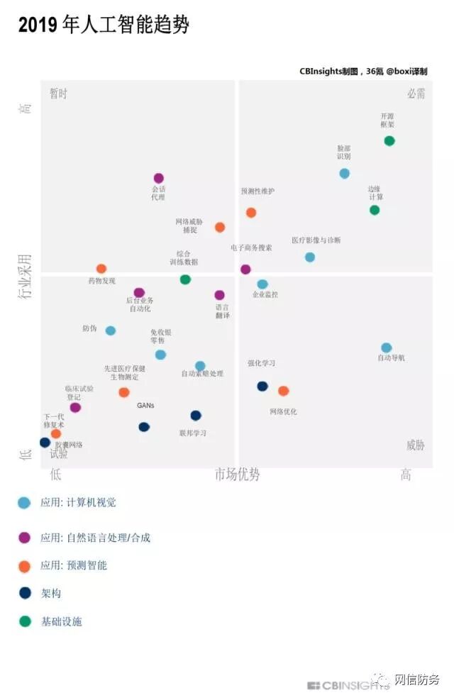 编者按:关心AI的人一定希望了解这个行业的最新发展趋势,最近行业分析机构CBInsights最近发布了2019年AI趋势报告正好能满足这个需求。这份84页的报告识别了25种AI趋势,运用CBInsights的NExTT分析框架,从行业采用度和市场优势两个维度对其进行归类,可以为不同参与角色提供决策参考。