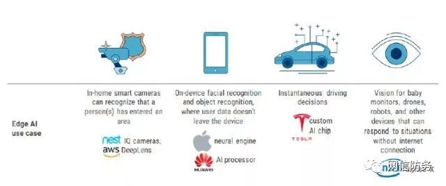 边缘AI对消费者电子、电信、医疗影像等主流行业均有应用意义。比方说监控摄像头的人脸识别、华为、苹果等智能手机的人脸与对象识别、Tesla AI芯片的即时驾驶决策、婴儿监视器、无人机、机器人视觉能力(无互联网连接)等。