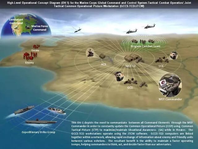 美海军陆战队指挥机构,依托全球指挥控制系统—战术作战行动(GCCS-TCO)与战斗行动中心和海上空中任务组(MAGTF)的指挥和控制(C2)系统与应用,联接各旅营及军兵种指挥所,使联合作战真正显现出来。