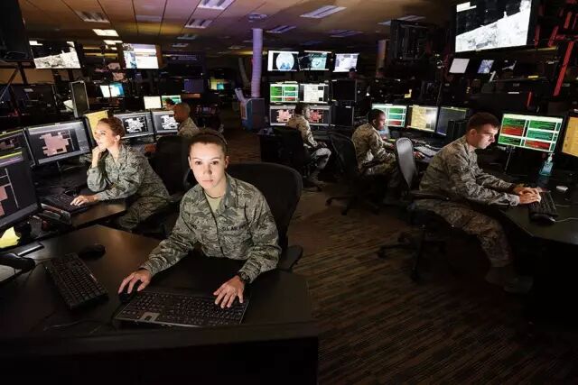 美国空军第480情报侦察和监视机组,分布式地面站1号作战楼层,作战参谋们依托系统各自独立工作,处理情报、获取有效情报。