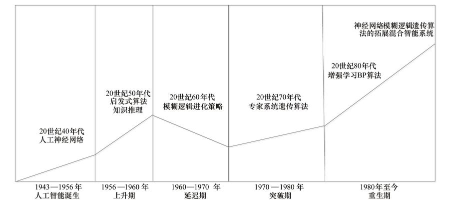 人工智能在近几十年的大致发展趋势如图 1 所示。由图 1可以看出:1943年人工智能开始萌芽,人工智能主要以人工神经网络的形式存在;1956年正式诞生,并逐步进入了上升期,启发式算法知识推理等开始盛行;而进入20 世纪 60 年代以后,开始了模糊逻辑进化策略,这一时期也是人工智能技术发展的延迟期;20世纪 70年代以后,专家系统遗传算法等开始出现,人工智能技术在这一时期取得了很大的突破;20世纪 80年代至今,又步入了一个新的发展阶段,越来越多的技术以及算法不断成熟,并且在很多领域得到了应用。