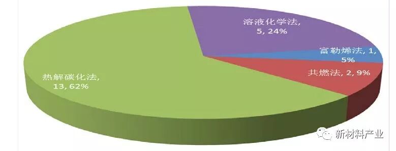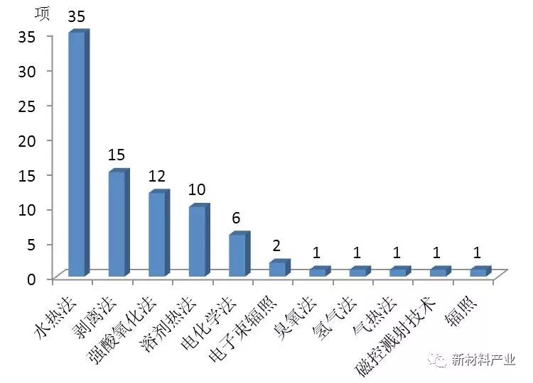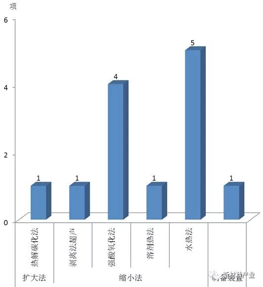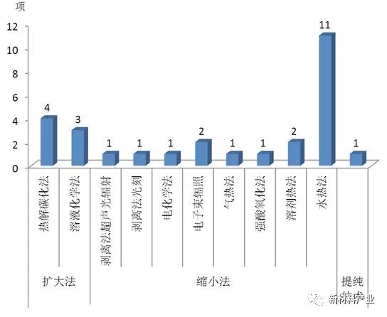 中国石墨烯量子点缩小法制备技术涉及水热法、剥离法、强酸氧化法、溶剂热法、电化学法、电子束辐照、臭氧法、氢气法、气热法、磁控溅射技术、辐照等11 种方法。