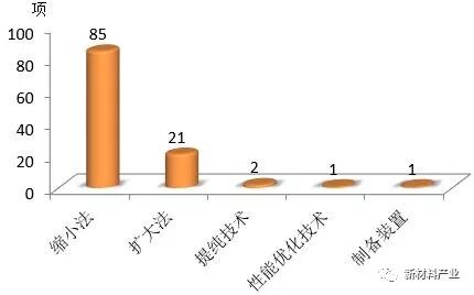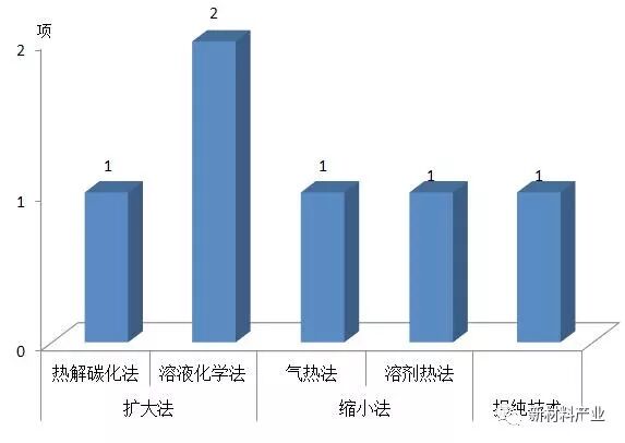 中科院上海微系统与信息技术研究所研发了缩小法、扩大法制备石墨烯量子点的技术以及提纯技术,其中扩大法采用了2 项溶液化学法技术和1 项热解碳化法技术,缩小法则分别采用了气热法和溶剂热法各1 项技术(见图10)。