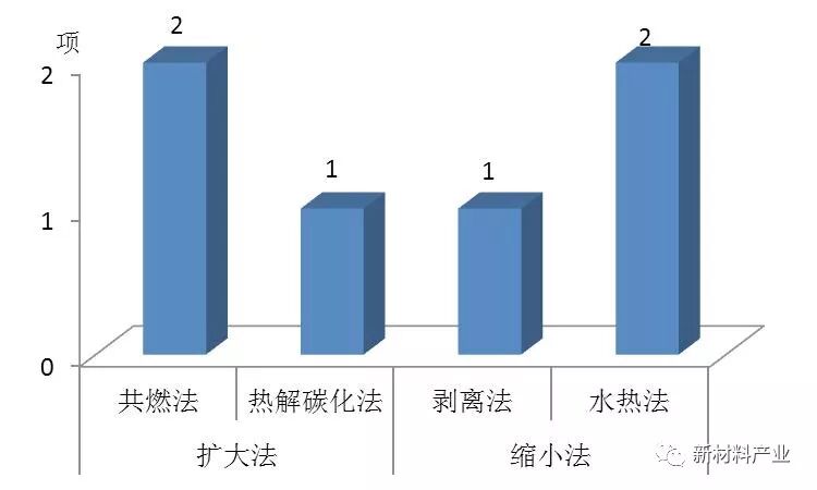 昆明物理研究所在缩小法及扩大法制备石墨烯量子点进行了研发,其扩大法参与度技术为2 项共燃法技术和1 项热解碳化法技术,而缩小法则采用了2 项水热法技术、1 项剥离法技术(见图11)。
